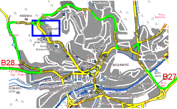 Anfahrt mit dem AutoB 27Wenn Sie Tübingen über die B 27 erreichen, folgen Sie den Schildern "Kunsthalle" (verlassen Sie die B 27 in Richtung "Lustnau, Nordstadt", folgen Sie den Schildern Lustnau, wenn Sie den "Wienerwald" sehen, biegen Sie links ab, biegen Sie direkt nach der Jet-Tankstelle rechts ab). Fahren Sie auf dieser Straße ("Nordring") immer gerade aus und folgen Sie nicht dem Schild "Kunsthalle", welches in der Nähe einer Bushaltestelle nach links zeigt. 500m hinter diesem Schild befindet sich unser Institut auf der linken Seite. Um zum Parkhaus zu gelangen, biegen Sie zuerst nach rechts ab (hinter einer Bushaltestelle zeigt ein Schild "Naturwissenschaftliche Institute" nach rechts), biegen Sie dann sofort wieder nach links ab. B 28Wenn Sie Tübingen über die B 28 erreichen, folgen Sie den Schildern "Kunsthalle" (am Stadtrand biegen Sie nach links in Richtung "Hagelloch" ab, nach 2 km biegen Sie rechts in Richtung "Nordstadt, Naturwissenschaftliche Institute" ab). Wenn Sie ein Schild "Naturwissenschaften" sehen, welches nach rechts zeigt, müssen sie nach rechts abbiegen. Das Parkhaus befindet sich dann auf der linken Seite. Zum Vergrößern und Ausdrucken bitte auf die jeweilige Karte klicken! Anfahrt mit dem Zug / Bus:Vom Hauptbahnhof / Omnibus-Bahnhof Tübingen gelangen Sie samstags mit den Linien 5, 8 (Umstieg in Linie 14) und 17 (Umstieg in Linie 5) zur Morgenstelle (Haltestelle „BG Unfallklinik“).